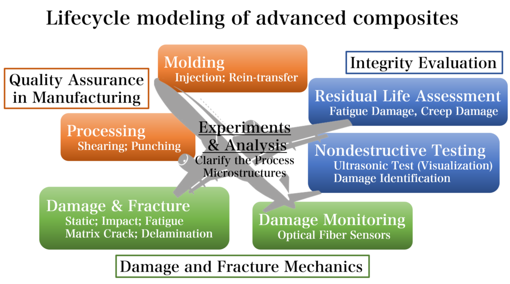 Strict weight reduction is required for aerospace vehicles, and advanced composite materials have been frequently used because of their high specific strength and modulus. However, a lightweight aircraft design that fully utilizes the characteristics of composites has not been achieved. In order to overcome this problem, the Strength and Vibration Laboratory aims to enhance reliability of composite structures through modeling the material’s life-cycle from manufacturing to damage progress and fracture.