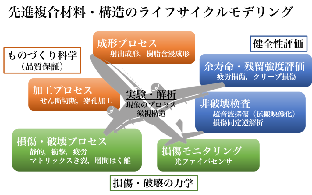 航空宇宙機では軽量化が厳しく要求され,軽量かつ高強度・高剛性な先進複合材の利用が広がっています。しかし,その特徴を十分に発揮した航空機の軽量化構造設計はいまだ実現していません。この課題を克服するために,強度振動学研究室では,先進複合材の成形から損傷進展・破壊という一連のプロセス,すなわち構造材料の一生のモデリングを通じて,材料や構造の信頼性を高める研究を行っています。